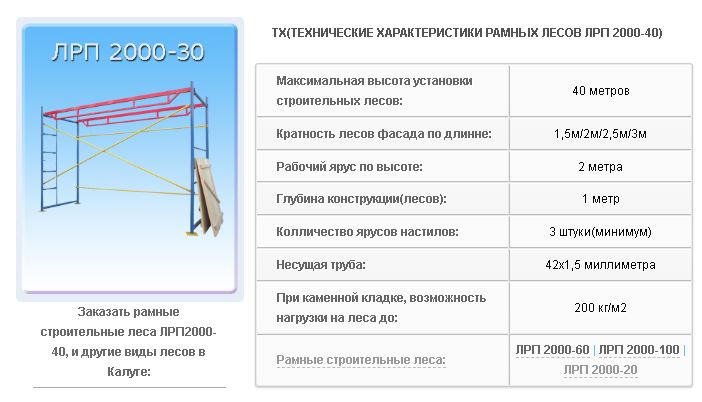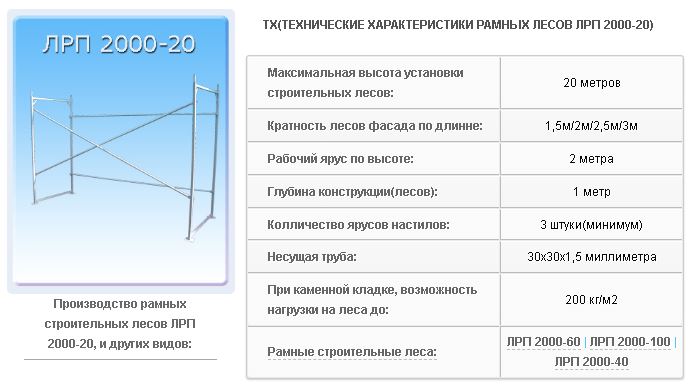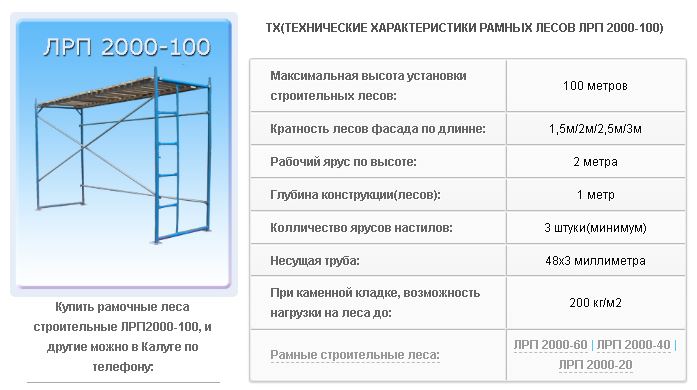 Строительные рамные леса данного типа устанавливаются на высоту до 100 метров, изготавливаются из толстой трубы 48мм. Рамочные леса типа ЛРП 2000-100 имеют свои хитрые и необходимые функциональные особенности строительных лесов. При установке и монтаже строительных лесов ЛРП2000-100 на высоту свыше 60 метров, стоит учитывать, что необходимо добавлять диагональные связи в каждую створку собираемых лесов. При кирпичной строительной кладке или каменной необходимо учитывать вес рабочих и материала, часто добавляют как можно больше настилов для удержания такого количества веса. Данный вид строительных лесов рамочных, часто комбинируют с клиновыми строительными лесами